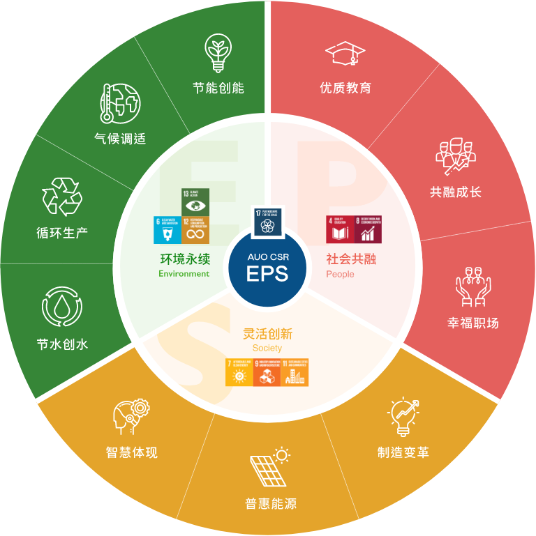 根据联合国所发展的17项永续发展目标,OD体育光电以「超越企业社会责任,创造共享价值」为企业永续愿景发展蓝图,订出环境永续、共融成长与灵活创新的EPS(Environment, People & Society)三大永续发展主轴;以响应日益受关切的环境议题与社会共融趋势。