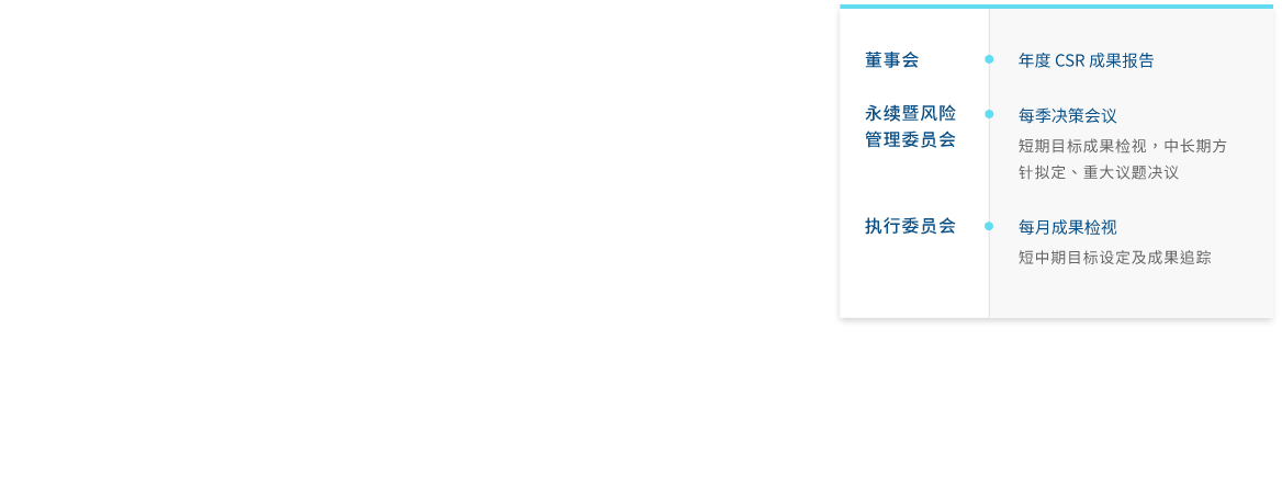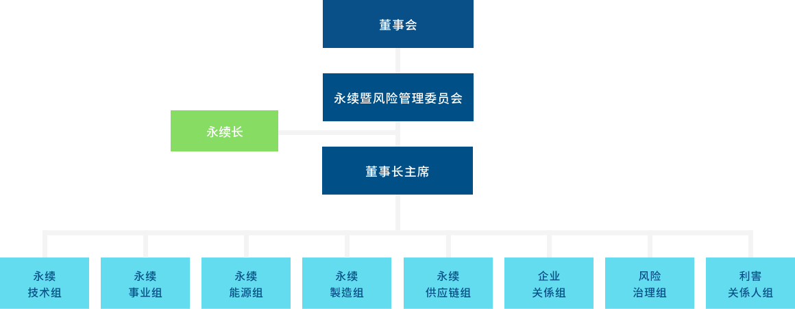 OD体育「可持续暨风险管理委员会」由董事长及2名独立董事组成,每年至少召开2次会议,下辖永续暨风险执行委员会,依各组工作方针进行子委员会之运作,透过副总等一级主管担任主委,带领各子委员会运作及跨单位合作,将愿景蓝图展开成各组目标及方案,每月进行检视,每季向董事长报告以决策重大议题,每年则依企业社会责任守则规范向董事会报告运作成效。